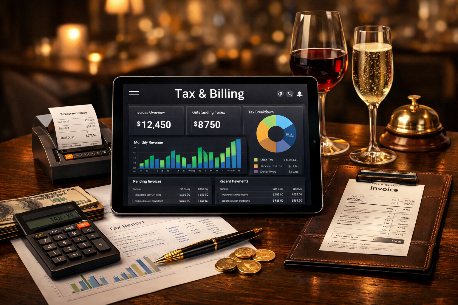 Flexible tax configuration with CGST, SGST, IGST, and service charge support.